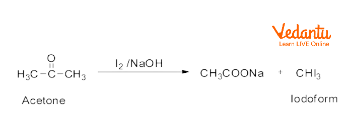 $$ CH_3COCH_3 + 3I_2 + 4NaOH \rightarrow CHI_3 \downarrow + CH_3COONa + 3NaI + 3H_2O $$