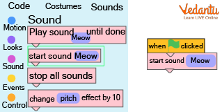 Step 3: Move the "start sound meow" block beneath the "when green flag clicked" block by dragging it from the sound block. This building block is in charge of producing the meowing noise.