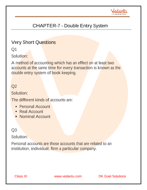 You can access DK Goel Solutions for Double Entry System as a downloadable PDF on the official Vedantu website. Visit the chapter resource page and find the PDF link for class 11 Accountancy Chapter 7.
