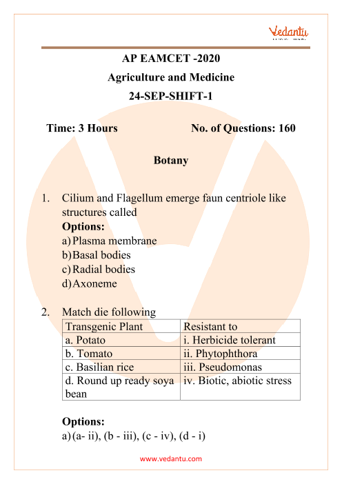 AP EAMCET Medical and Agriculture Question Paper 24th September 2020 Shift 2 - PDF Download