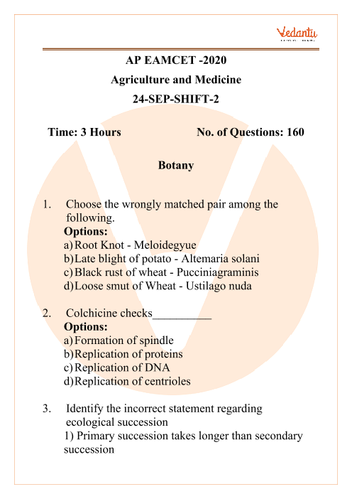 AP EAMCET Medical and Agriculture Question Paper 24th September 2020 Shift 2 - PDF Download