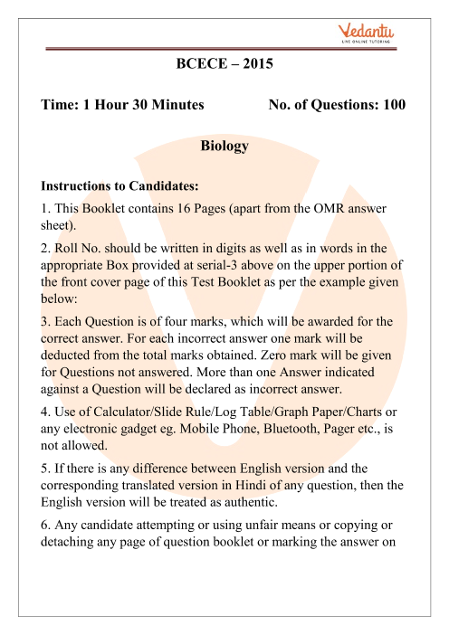 2015 Biology BCECE Previous Year Question Papers