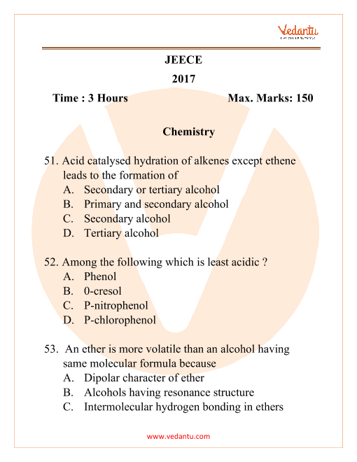 For more information, refer to https://www.vedantu.com/exams/jeece-chemistry-question-paper-2017