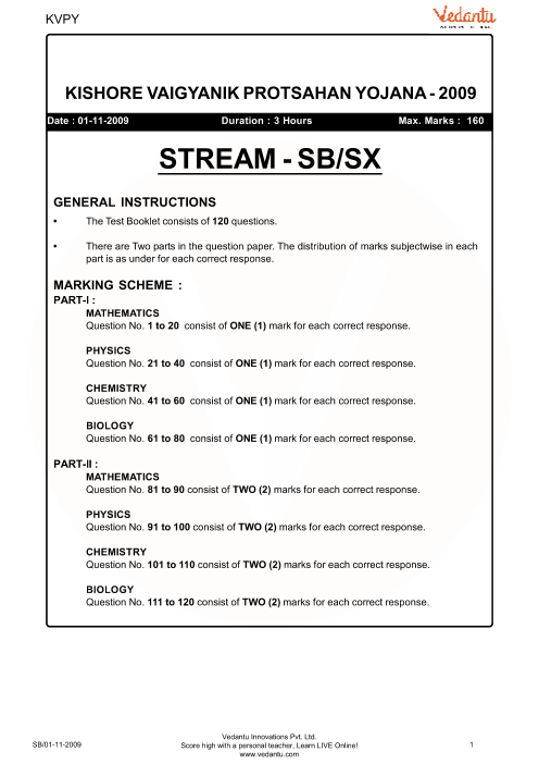 KVPY Class 12 SX & SB Stream Previous Year Question Paper -2009 with Answer Keys