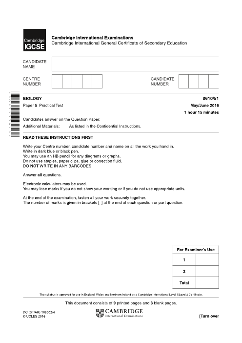 Cambridge IGCSE Biology-0610 Past Question Paper-5 (June 2016)