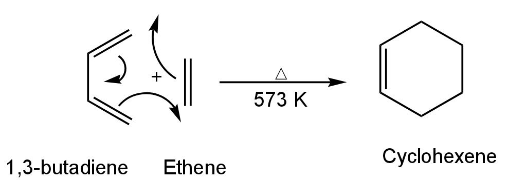 Note: Ethene and other simple alkenes normally are weak dienophiles and react with 1,3-butadiene only under drastic conditions and in low yield. But, when the hydrogen atoms in the diene are replaced with various electron-attracting groups such as chlorine or bromine, electron-donating groups the reaction happens on its own.