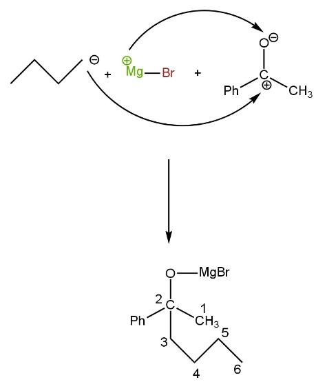 Now, the positive part of the Grignard reagent attacks the negative part of phenyl ethanone, and the negative part of the Grignard reagent attack the positive part of phenyl ethanone. Grignard reagent (\[{{C}_{4}}{{H}_{9}}MgBr\]), alkyl group,\[{{C}_{4}}{{H}_{9}}\]negatively charged while MgBr is positively charged such as