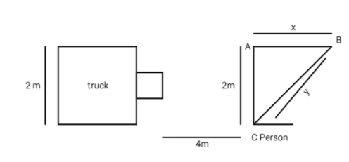 A truck which is $2m$ wide is moving with a uniform velocity along a straight line. At the same time a pedestrian starts to cross the road. Let us assume that person is in the position C, he wants to cross the road and reach point B. the distance between the truck and the person is 4m. Let A be the point parallel to the person at C at a distance $2m$. With this draw a triangle joining the points A, B and C. Then AC is $2m$, let AB be x and let BC be y.
