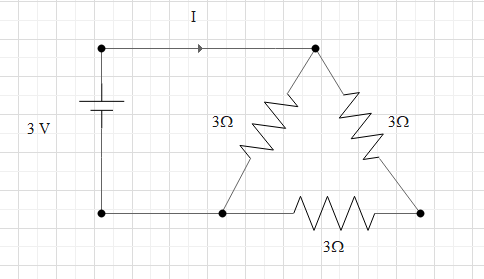 A 3 Volt battery with negligible internal resistance is connected in a circuit as shown in the figure. The current I in the circuit will be