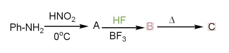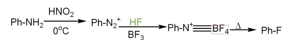 Aniline and $HN{{O}_{2}}$ combine in the first step to produce diazonium salt, which is then combined with hydrogen fluoride ($HF$) and fluoroboric acid ($B{{F}_{3}}$) to create fluoro benzene ($PhF$). Fluorobenzene is a colourless liquid having the molecular formula ${{C}_{6}}{{H}_{5}}F$. It is also known as phenyl fluoride. It is a flammable substance.