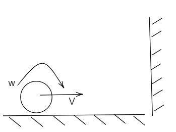 A ball having velocity $v$ towards right and having angular velocity clockwise approaches the wall. It collides elastically with the wall and moves towards the left. Ground and wall are frictionless. Select the correct statement about angular velocity of the ball after collision.