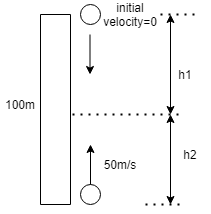 Here in the image we can see a tower is there of 100m and a ball from 100m height is falling under gravity which is 10$\dfrac{m}{{{s^2}}}$ and another ball is there at the bottom of tower and thrown upward with a velocity of 50$\dfrac{m}{s}$. We need to find the time when they will meet each other.
