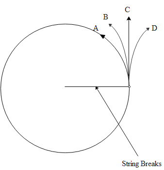 A ball on a string is swung in a vertical circle. The string happens to break when it is parallel to the ground and the ball is moving up. Which trajectory does the ball follow?