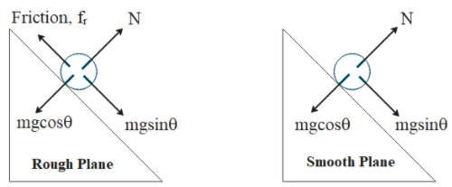 When the ball moves down a rough plane, there are a total of four components of forces acting in it as shown in the figure below. The horizontal components cancel each other out as there is no horizontal displacement clearly. Similarly, for a ball rolling down a smooth plane there are three components of forces acting as shown below: