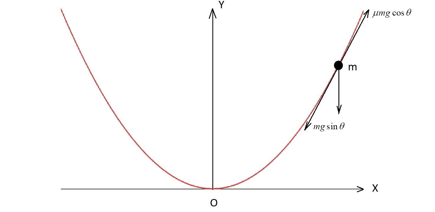 Hint: The coefficient of friction can be calculated and expressed in terms of the equation of motion. This can be done by drawing the free-body diagram of the bead and computing the forces acting on the bead when it is in motion along the curve.