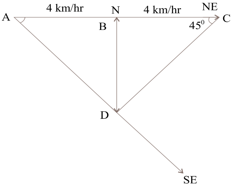 Hence the correct answer is option A) $4\sqrt 2 {\text{ km/hr towards south east}}$.