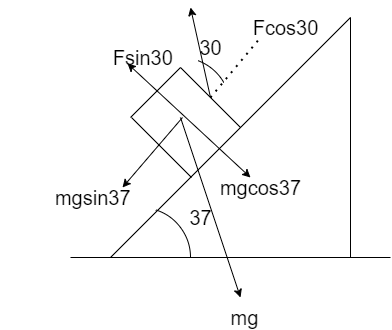 ${F_x} + mg\sin {37^ \circ } - F\cos {30^ \circ } = 0$