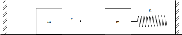 A block of mass m moves with a speed v towards the right block which is in equilibrium with a spring attached to a rigid wall. If the surface is frictionless and collisions are elastic, the frequency of collisions between the masses will be: