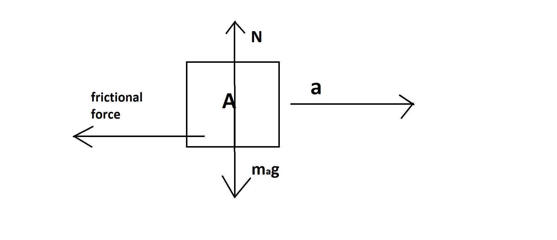 Now we have to think about the condition of slipping of body A. When frictional force is less than equal to applied force then it will start slipping. So, let's equate this. If we acceleration of the system is a then force on the forward direction is given by \[F = ({m_a} + {m_b})a\] here ${m_a},{m_b}{\text{ is the mass of body A and B}}{\text{.}}$ we already told you that frictional force is equal to $f = \mu N$ so we can write here that $f = \mu {m_a}g$ . So now we can write ${m_a}a = \mu {m_a}g$.Actually here we are considering a pseudo force ${m_a}g$. Also, we can write $a = \mu g$. Hence option A is the correct option.