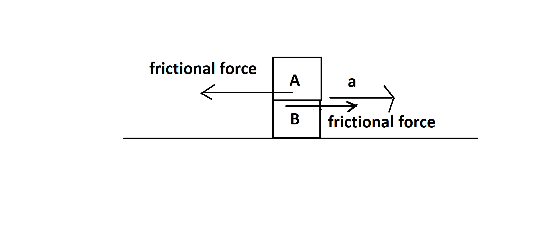 Here we consider that the whole system is given an acceleration a. The surface is smooth so that there is no friction between the body B and the surface. The frictional force is proportional to the normal force, which is the force that is perpendicular to the surfaces. The coefficient of friction, $\mu $, determines how much friction there is between the two surfaces. We can define friction as $f = \mu N$ where N is the normal. Now if we look at the picture, we see that there is a friction between the surfaces of A and B. As the system is moving forward then frictional force of body A in backward direction. Now do another diagram for body A.