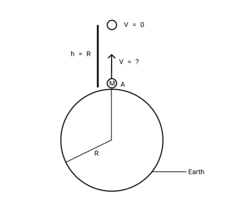$ \Rightarrow \dfrac{1}{2}m{v^2} + \dfrac{{ - GMm}}{R} = 0 - \dfrac{{GMm}}{{R + R}}$