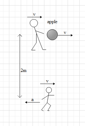 Therefore, for the apple to fall in the hands of the second boy, the hand of the boy must also cover a horizontal distance of vt. However, the train is under retardation, which means that its velocity is decreasing. This means that the distance that the boy’s hand will cover in time t is less than vt.