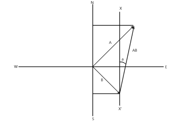 Note: for clarity, the angle \[a\] is the angle the velocity makes with the north axis because by mathematical principles the angle a line A makes with another line B is equal the angle the line A will make with another line C which is parallel to the line B. the line XX’ is parallel to the north axis.