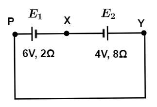 A cell ${E_1}$ of emf $6V$ and internal resistance $2\Omega $ is connected with another cell ${E_2}$ of emf $4V$ and internal resistance $8\Omega $ (as shown in the figure). The potential difference across points X and Y is: