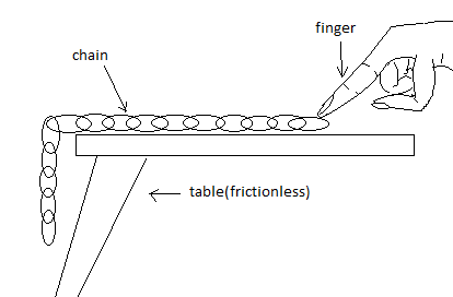 A chain is held on a frictionless table with one-fourth of its length hanging over the edge as shown in figure. If the chain has length $L = 28cm$ and mass $m = 0.012Kg. $how much work is required to pull the hanging part back onto the table?