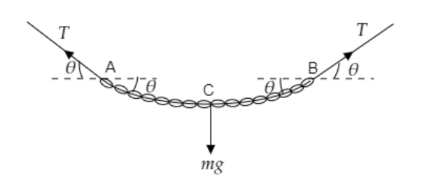 Note: The force balance equation in the vertical direction is obtained by expressing the total forces acting on the chain i.e., $T\sin \theta + T\sin \theta - mg = 0$ . The weight has a direction opposite to that of the vertical components of the tension at A and B. We take the upward direction to be positive and so weight is negative.