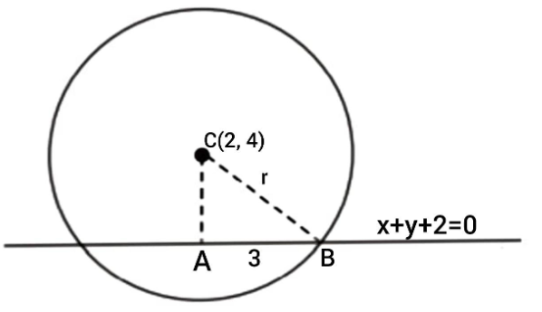 Hint: In this question, given a circle with centre at \[(2,\ 4)\] and the line \[x + y + 2 = 0\] cuts a chord, also the length of the chord is \[6\] . Before proceeding with this type of question, we must draw the circle with center \[(2,4)\] with the given above conditions so that we can understand the question more clearly. Then we need to compare the given line equation with \[Ax + By + C = 0\] to get the value of \[A\], \[B\] and \[C\]. Then we can use the formula of the length of the perpendicular from a point to the line. Further by using Pythagoras theorem, we can find the radius of the circle.