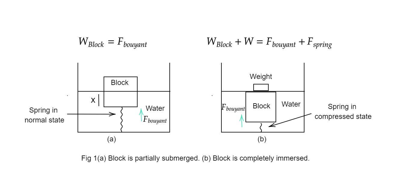 Note: Focus on the different forces acting in the vertical direction. Remember that when a spring is in its relaxed state, it exerts no force on the block. Then the force exerted by the spring in the second case will be proportional to the length by which the body has displaced.
