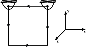 A current carrying a uniform sq. frame is suspended from hinged supports as shown within the figure such that it will freely rotate regarding its top. The length and mass of every facet of the frame are 2m and 4kg respectively. A uniform magnetic field \[\begin{array}{*{20}{c}} {\overrightarrow B }& = &{(3\widehat i + 4\widehat j)} \end{array}\] from vertical and released, it remains in equilibrium. What's the magnitude of current (in A) within the wireframe?