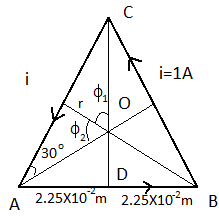 $\Rightarrow B=3\times {{10}^{-7}}\times \dfrac{1}{\dfrac{2.25\times {{10}^{-2}}}{\sqrt{3}}}\left( \dfrac{\sqrt{3}+\sqrt{3}}{2} \right)$