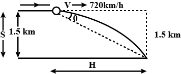 {\text{Then H = horizontal distance = }}vt = 720 \times \sqrt {\dfrac{{2 \times 1500}}{{9.8}}} = 3.5km \\