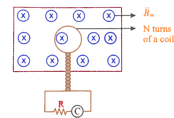 A flip coil consists of N turns of circular coils which lie in a uniform magnetic field. Plane of the coils is perpendicular to the magnetic field as shown in the figure. The coil is connected to a current integrator which measures the total charge passing through it. The coil is turned through $180^\circ $ about the diameter. The charge passing through the coil is: