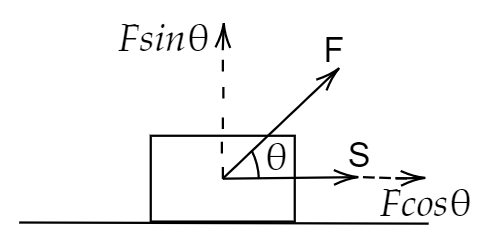 Consider an object which is getting displaced in the horizontal direction \[S = 0.4m\]. With respect to this horizontal direction a force of 5N is acting at some angle, by this, the object is gaining 1 J of kinetic energy. Let us find the horizontal component of force. In order to do that, the F is resolved into two components that are along the horizontal direction as \[F\cos \theta \] and vertical component as \[F\sin \theta \].