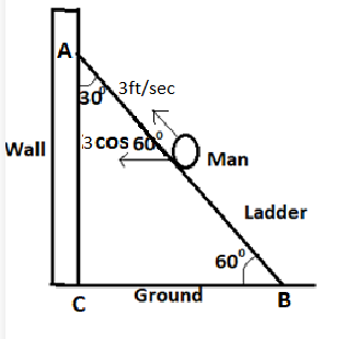 A ladder is resting with the wall at an angle of 30 degrees. A man is ascending the ladder at the rate of 3ft/sec. Find his rate of approaching the wall.