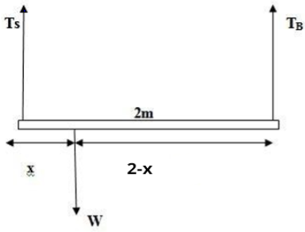 Now let the weight hanged on the rod is at $x{\text{ m}}$ from the steel wire as shown in the figure. So its position from the brass wire will be $\left( {x - 2} \right){\text{ m}}$.