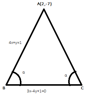 A line \[4x + y = 1\] passes through the point \[A\left( {2, - 7} \right)\] meets the lines \[BC\] whose equation is \[3x - 4y + 1 = 0\] at the point \[B\]. The equation of the line \[AC\] so that \[AB = AC\], is