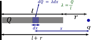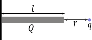 A line charge of length $l$ and charge $Q$ uniformly distributed over the length is placed at a distance $r$ from one edge from a point charge $q$ as shown. Find the force on the point charge: