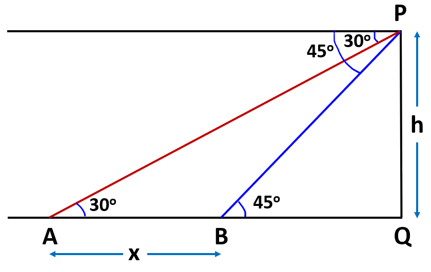 Then \[AB = x\], \[BQ = y\], \[PQ = h\], \[\angle PAQ = 30^\circ \] and \[\angle PBQ = 45^\circ \]