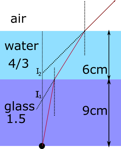 A man places a rectangular glass slab of thickness $9cm$ on a newspaper. On the top of glass slab he placed a glass beaker of negligible wall thickness containing water up to a height of $6cm$ . if refractive index of glass is $1.5$ and refractive index of water is $\left( {\dfrac{4}{3}} \right)$ , what is the apparent depth of the newspaper?