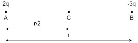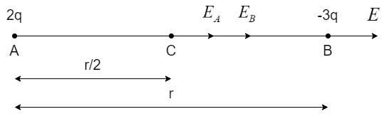 $\Rightarrow {E_B} = - \dfrac{1}{{4\pi {\varepsilon _0}}}\dfrac{{ - 3q}}{{{{\left( {\dfrac{r}{2}} \right)}^2}}} = \dfrac{1}{{4\pi {\varepsilon _0}}}\dfrac{{12q}}{{{r^2}}}$
