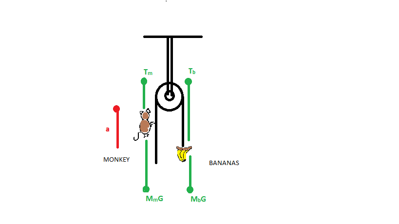Similarly, the forces acting on the bananas are \[{{{M}}_{{b}}}{{G}}\] and tension \[{{{T}}_{{b}}}\] because of the rope.