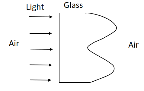 As we know that the rays of light will travel more in air than glass medium. If the glass medium is greater than the wavefront will be slack. Hence the shape of the emergent wavefront will be the figure given as,