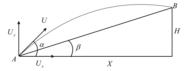 Let us consider a particle is projected at a velocity $U$ and after $t$ seconds it reaches point $B$. Initially the angle of elevation was $\alpha $ and after $t$ second angle of elevation is $\beta $. The horizontal distance travel by the particle is $X$. In the subscript, $x$ denotes the properties in $x$ direction and $y$ denotes the properties in $y$ direction.