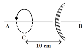 A particle revolves in clockwise direction (as seen from point A) in a circle C of radius 1 cm and completes one revolution in 2 sec. The axis of the circle and the principal axis of the mirror M coincide, call it AB. The radius of curvature of the mirror is 20 cm. Then, the direction of revolution (as seen from A) of the image of the particle and its speed is