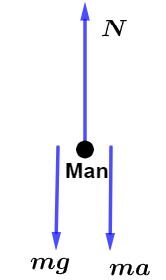 From the drawn free diagram of man, we can see that the normal reaction $N$ of the man which will be the reading of spring balance is in the upward direction, the original weight $mg$ is in the downward direction and man is also accelerating in the downward direction with an acceleration of $a = 1.8m{s^{ - 2}}$ which will produce a force in the downward direction with magnitude $ma$.