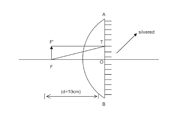 A plano-convex then lens of focal length \[10{\rm{ }}cm\] is silvered at its plane surface. The distance \[d\;\] are which an object must be kept in order to get its image on itself is:
